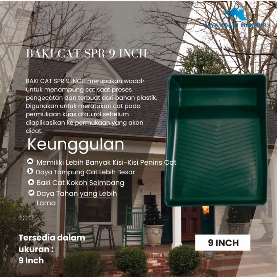 BAKI CAT merupakan wadah untuk menampung cat saat proses pengecatan dan terbuat dari bahan plastik. BAKI CAT digunakan untuk meratakan cat pada permukaan kuas atau rolller sebeum diaplikasikan ke permukaan yang akan dicat.